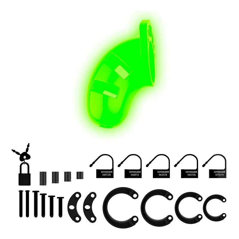 Pour obtenir l’effet vert fluorescent dans l’obscurité de cette cage à pénis, exposez celle-ci à la lumière avant de l’utiliser.