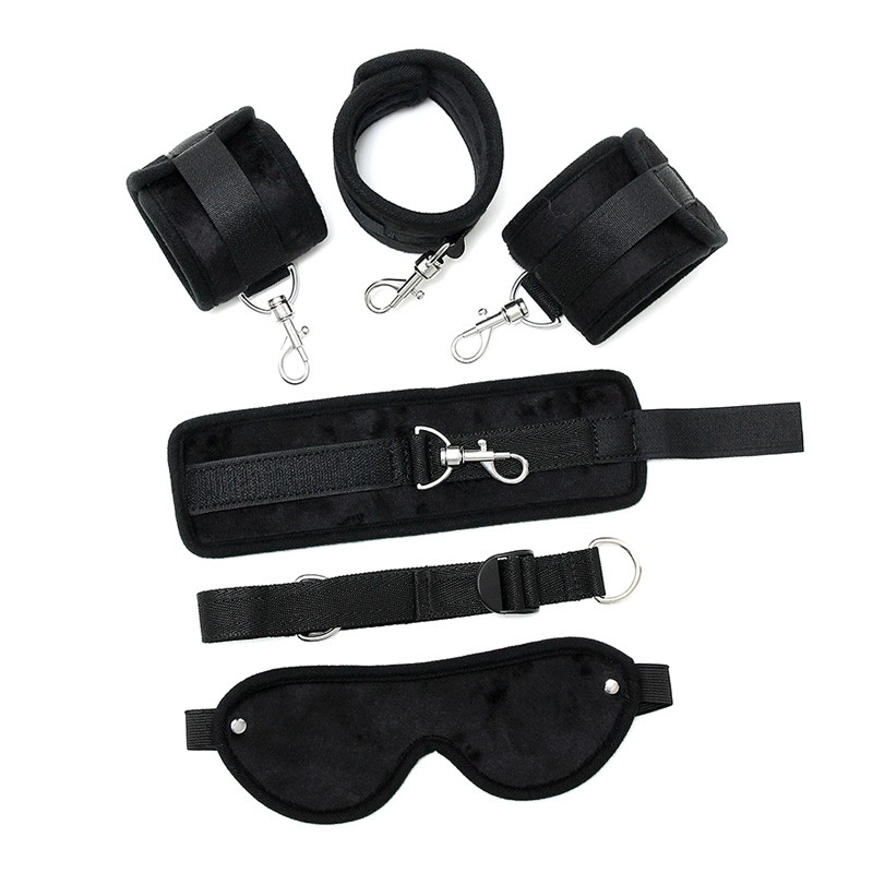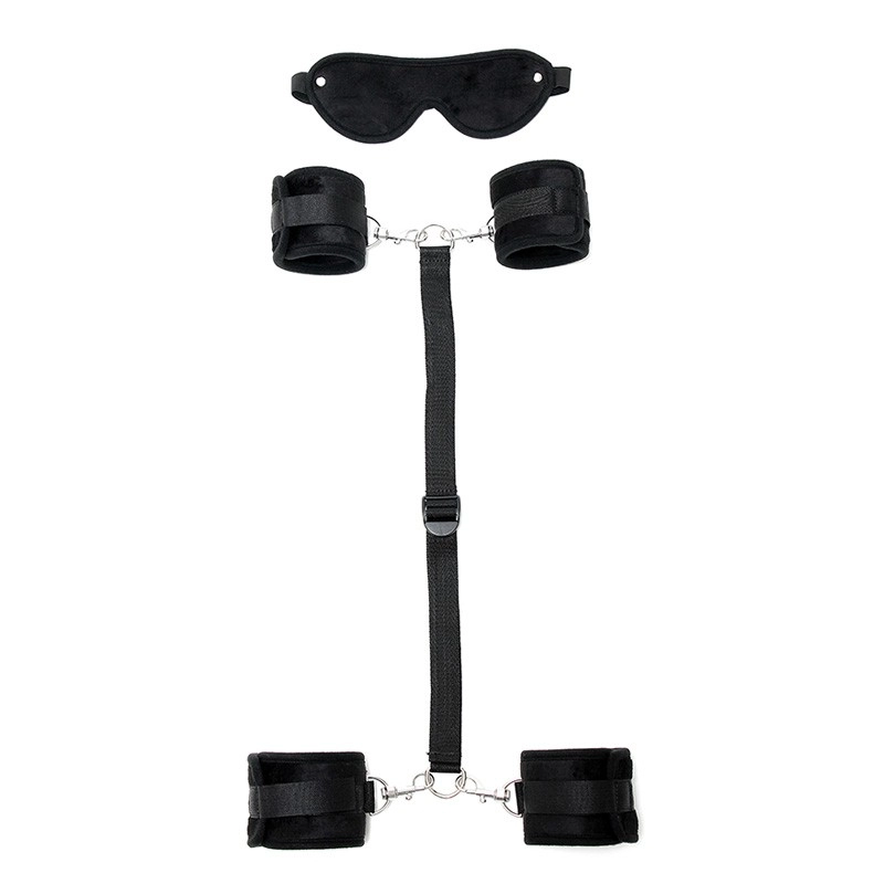 Ce kit BDSM est composé d’une paire de menottes pour les poignets, une paire de menottes pour les chevilles, une sangle réglables, un masque pour les yeux et 4 crochets carabines.