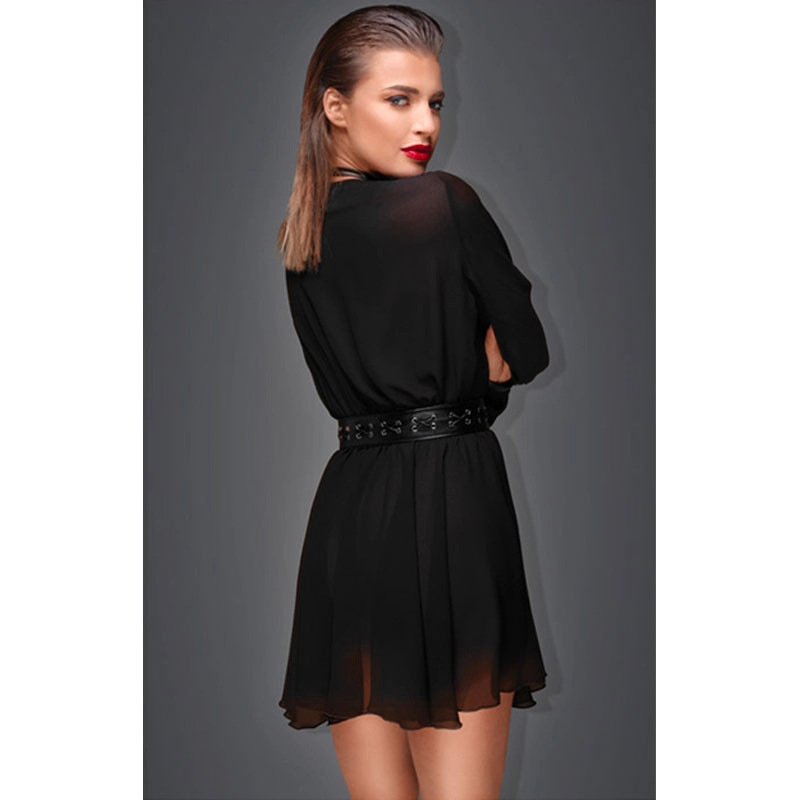 Voici la mini robe F150 de la marque Noir Handmade, une lingerie fine rĂ©alisĂ©e Ă partir dâ ne matiĂšre lĂ©gĂšre et douce qui survole les courbes et marque la taille, grĂące Ă sa ceinture en tissu effet mouillĂ© (wetlook).
