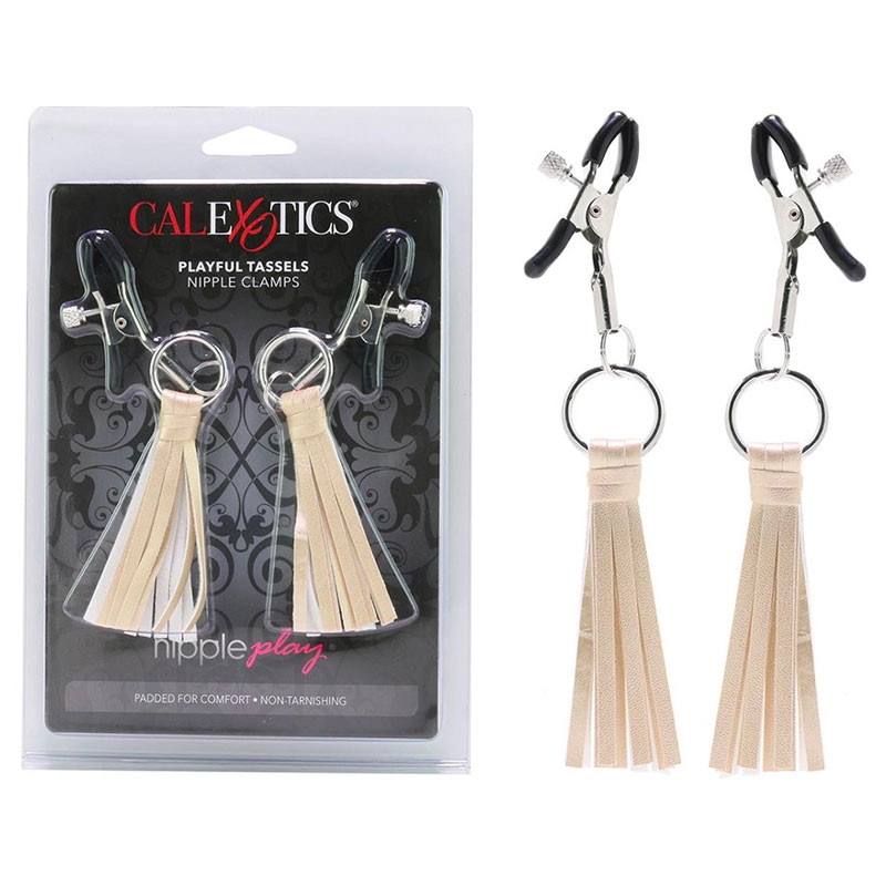 Cette paire de pinces à seins est constituée de 2 anneaux métalliques sur lesquels vous pourrez fixer une petite chaîne et de deux petits fouets.